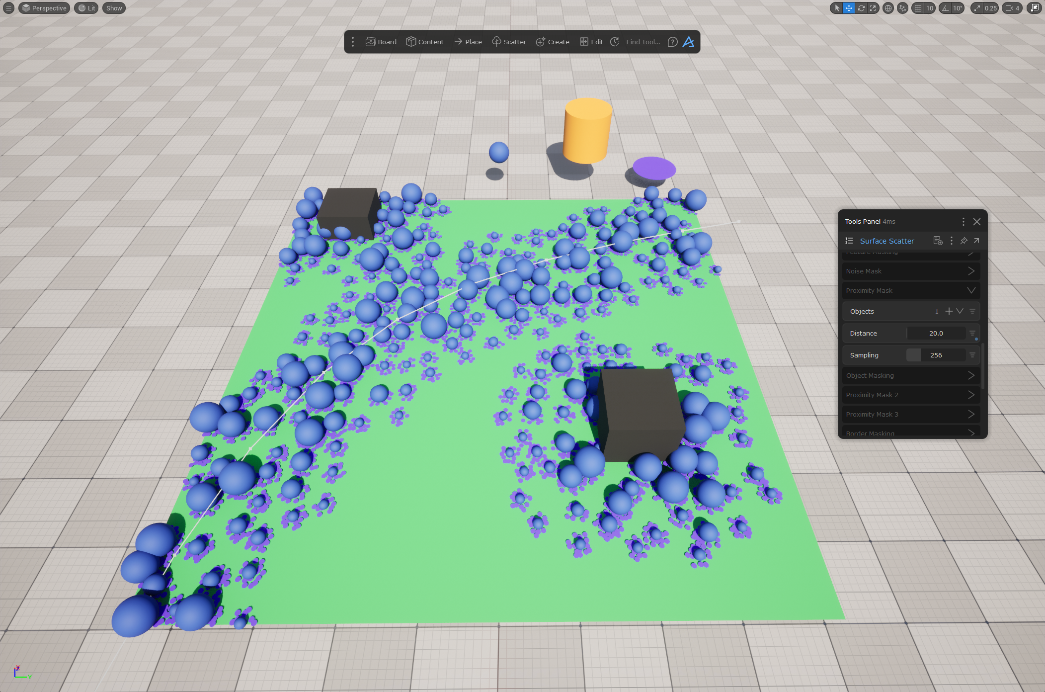 In the example above, we're using meshes and curves for masking, but relying on instances is just as easy: Select them in the viewport, and add them to the proximity objects.\
