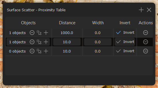From Dash 1.8.5, Surface Scatter has the ability to add an infinite number of proximity masks, which is done through the Proximity Table. This replaced the previous 3 Proximity Masks. In the Proximity Table, you can create groups, each having its own object, distance, and width values. You could, for example, use the first group to mask out some objects with a specific distance, and do the same with the other two groups.